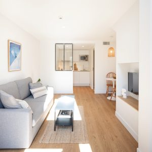 Vous profiterez d’un séjour lumineux équipé d’un confortable canapé, d’une chambre avec lit double et d’un bureau. L’appartement est aussi composé d’une cuisine ultra-équipée (lave-vaisselle, four, plaques de cuisson, machine à café Nespresso, etc.) avec un coin repas. Disposez d’une salle de bain avec une grande douche tropicale, d’un dressing aménagé avec placards ainsi qu’un lave-linge avec option sèche-linge.