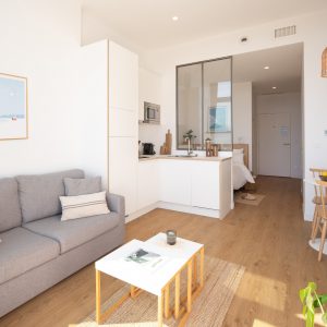 Vous profiterez d’un séjour lumineux équipé d’un confortable canapé, d’une chambre avec lit double et d’un bureau. L’appartement est aussi composé d’une cuisine ultra-équipée (lave-vaisselle, four, plaques de cuisson, machine à café Nespresso, etc.) avec un coin repas. Disposez d’une salle de bain avec une grande douche tropicale, d’un dressing aménagé avec placards ainsi qu’un lave-linge avec option sèche-linge.