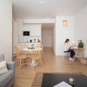 Smart TV, Mobilier design (canapé, table basse, meuble TV), Espace repas, Rideaux occultants